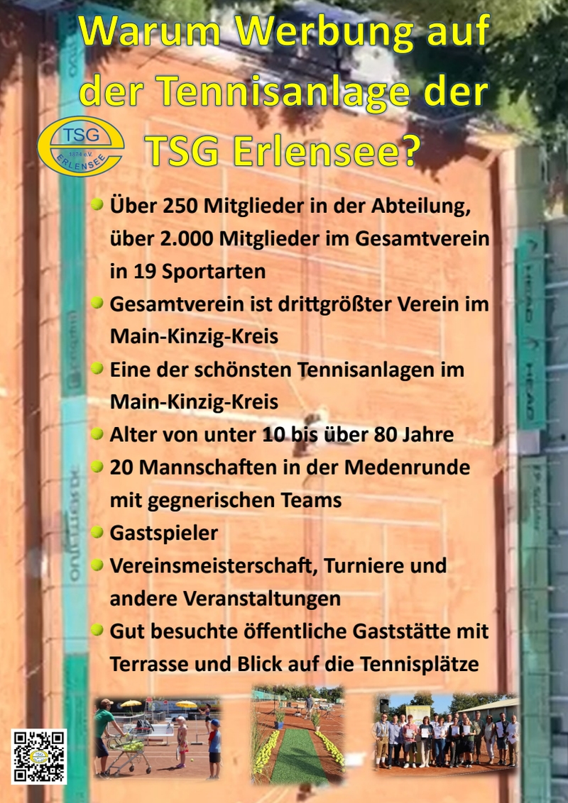 Wenn ihr Interesse an Werbung auf unserer schönen und gut besuchten Tennisanlage habt, sprecht uns gerne an. Wendet euch an vorstand@tsge-tennis.de.